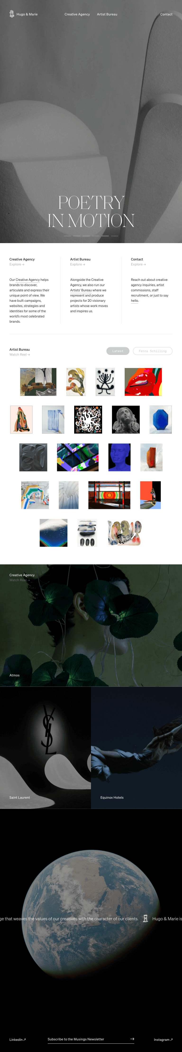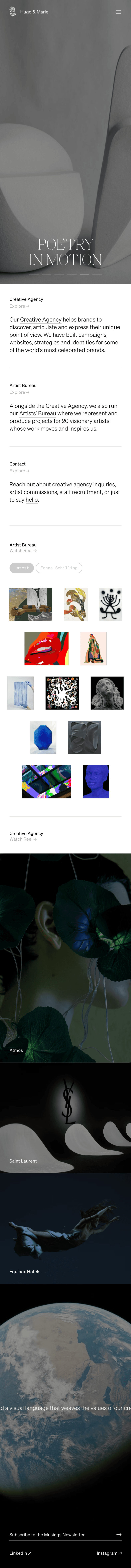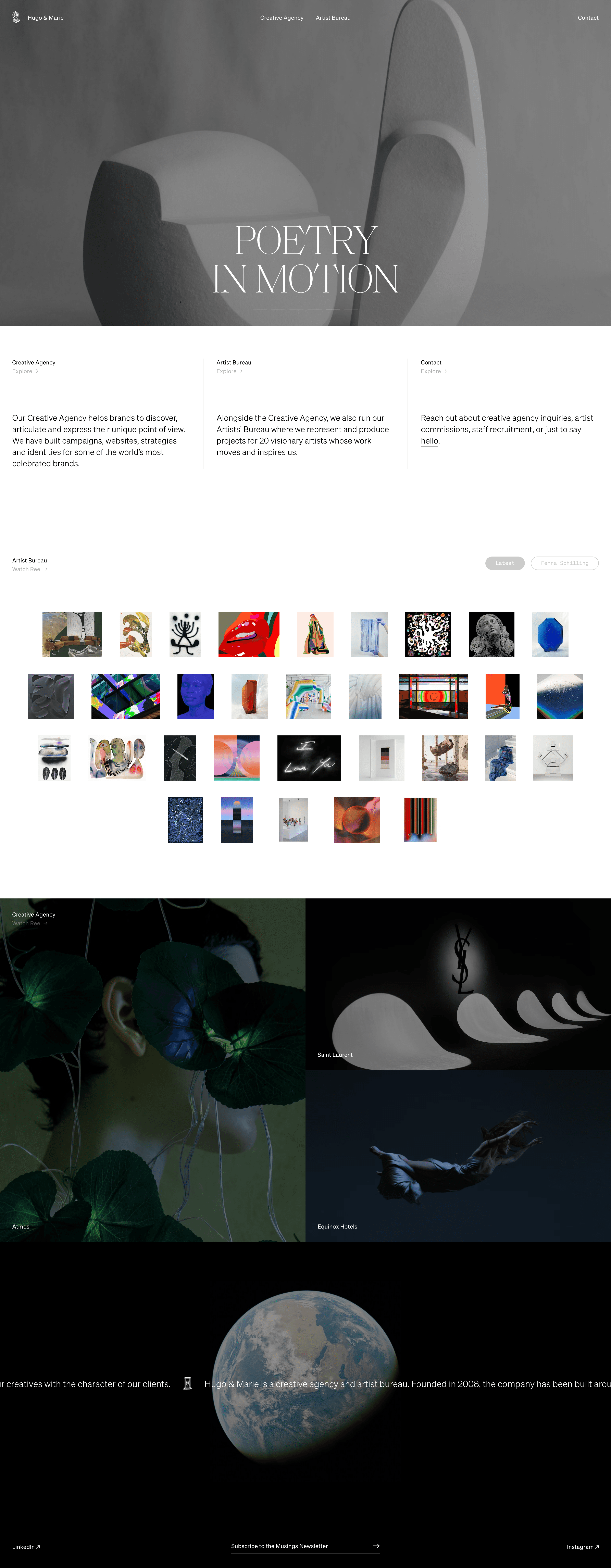 Hugo & Marie is a multi-disciplinary, independently owned creative studio and artist bureau. They work with businesses to create visual worlds craft brand strategy, design websites, and produce campaigns.
