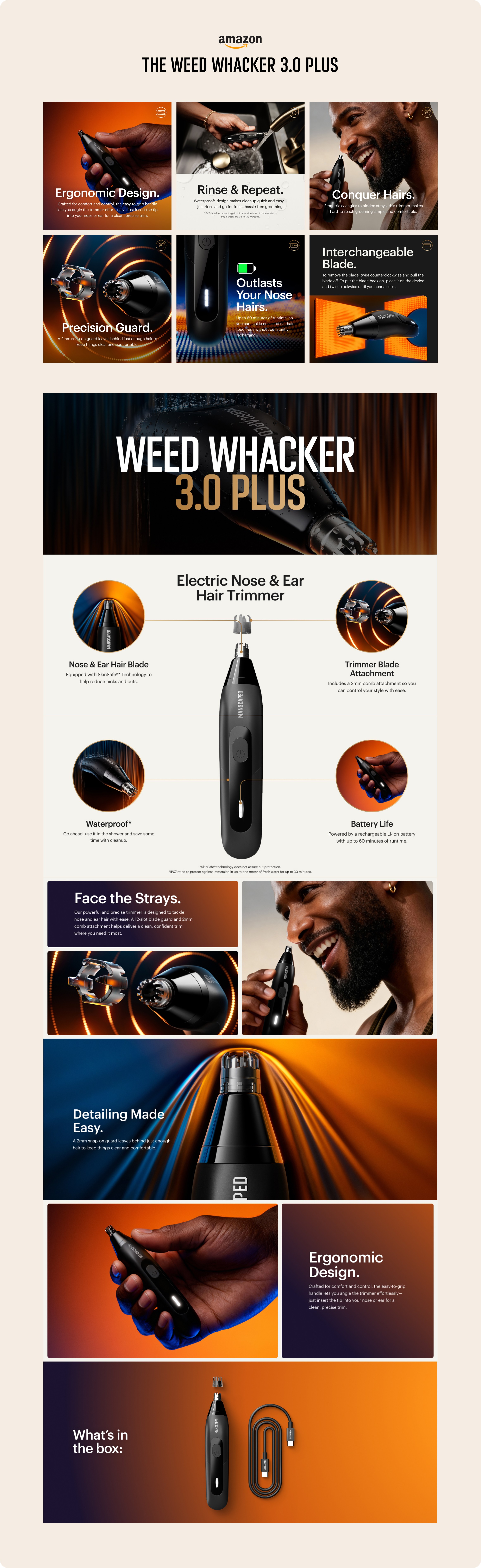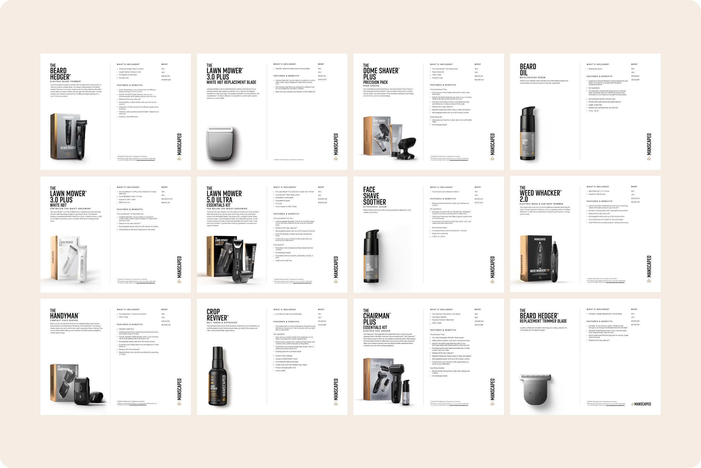 Manscaped has turned men's grooming into something unexpectedly entertaining — products engineered with precision, marketed with personality. My work centered on maintaining visual and tonal consistency across their brand: e-commerce experiences, Amazon optimization, packaging, social content, and sales collateral that balanced humor with product credibility.